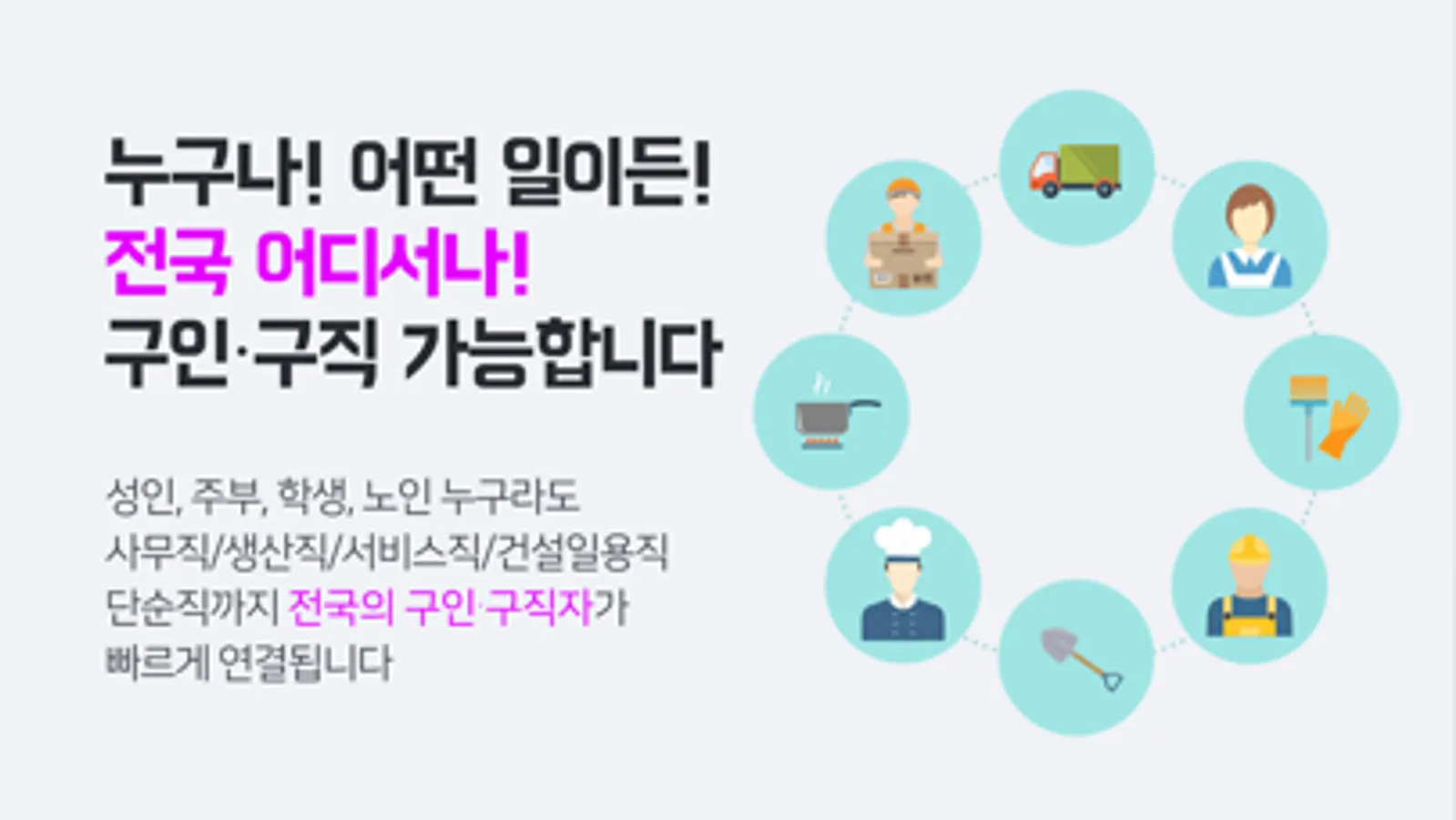 성인 남녀 뿐 아니라 주부,학생,100세 노인도 정규직, 사무직, 전문직 부터 일용직,알바 등 단순한 일자리까지 찾을 수 있습니다.