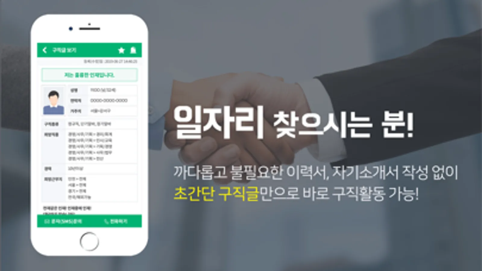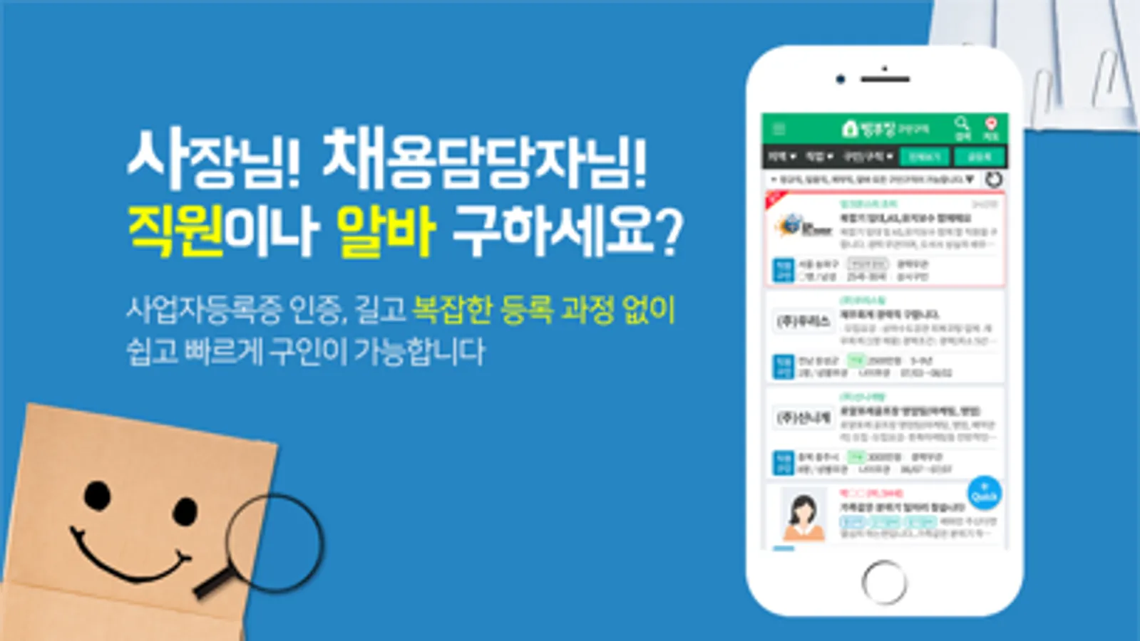 구인자는 사업자등록증 제출,복잡한 채용공고 등록/승인 과정 없이 구직자는 불필요한 이력서,자기소개서 작성 등의 번거로운 절차 없이 바로 활동할 수 있습니다.