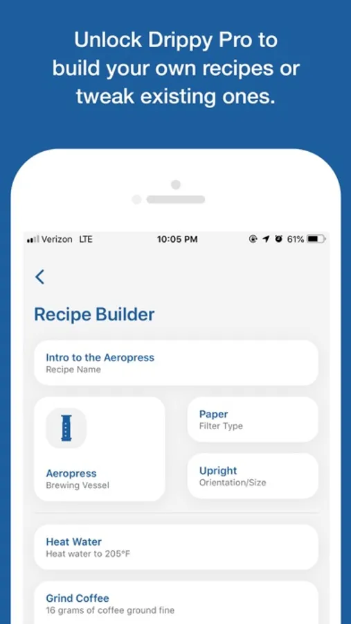 Want to tweak your recipes, or feeling confident enough to make your own? Drippy makes it easy with the Recipe Builder. Play with your brew settings, reorder your steps, and dial in the details until that coffee tastes just right.