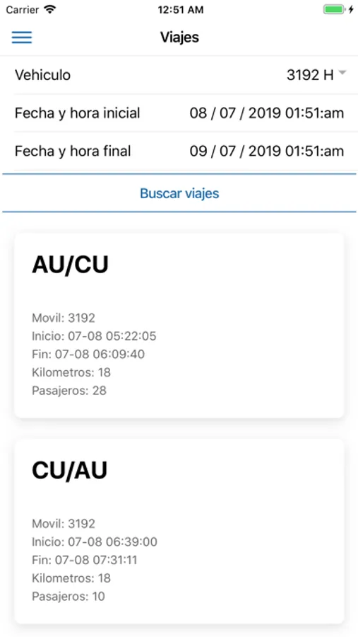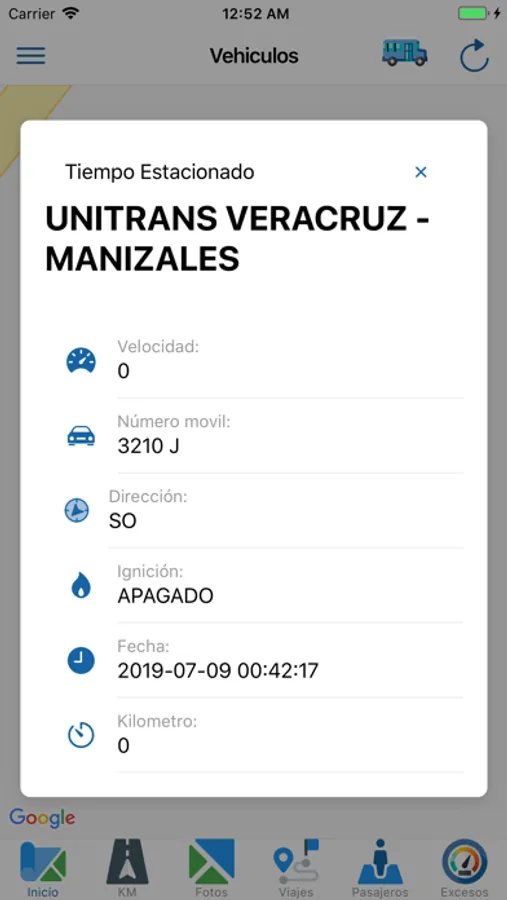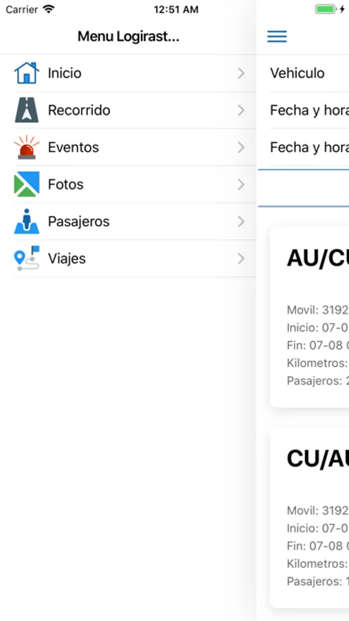 Aplicación de Logiratsreo en la cual se pueden visualizar los vehículos en el mapa en tiempo real, revisar los viajes realizados, las fotos registradas, pasajeros movidos en caso de tener contador de pasajeros instalado, toda esta información se puede consultar con una sola selección para el día actual entregando también la posibilidad de consultar para días anteriores.