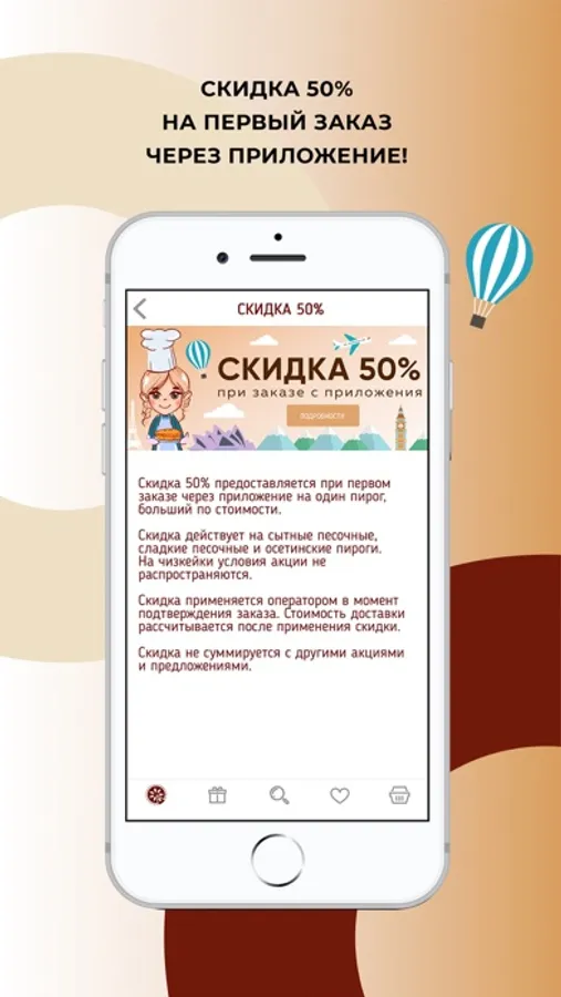 На первый заказ действует скидка 50%, чтобы ознакомиться подробнее с условиями акции, скачайте и установите приложение “Машенькины пироги”. Приятного аппетита!