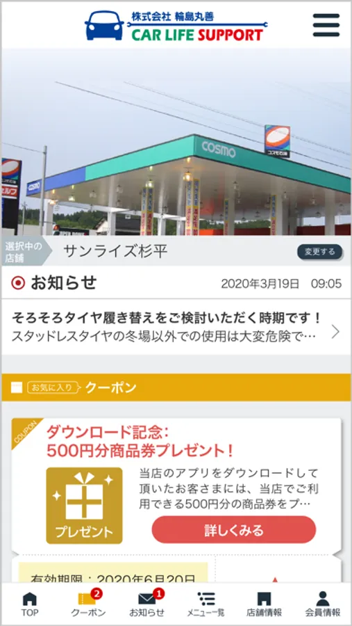 当社の公式アプリ「輪島丸善カーメンテサポート」ではアプリで簡単に洗車・コーティングなどのご予約や愛車のメンテナンス管理が可能の他、当店で利用いただけるお得なクーポンや各種メニューの割引情報を配信しております。