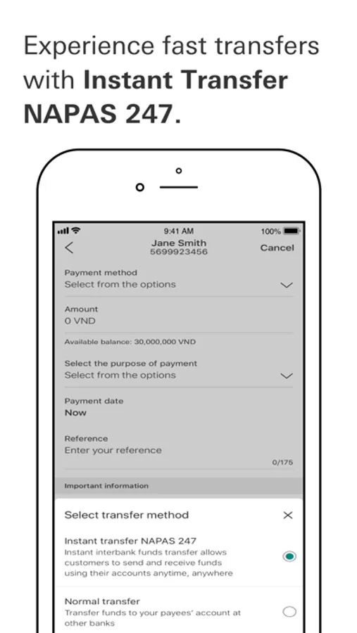 • Adding new payees and transfer funds to bank accounts within Vietnam instantly and conveniently at any time. Easily share payment details with your payees.