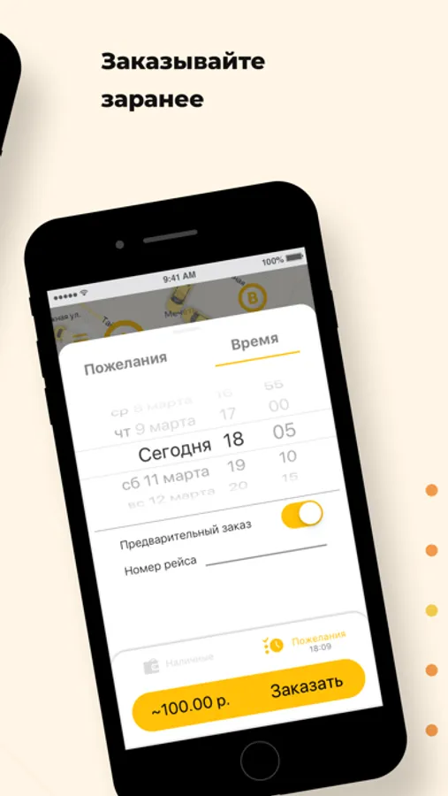 Выберите опцию “Предварительный заказ”. Поиск автомобиля начнется незадолго до заказа поездки, и автомобиль приедет к назначенному времени. Также вы будете заранее знать стоимость поездки.