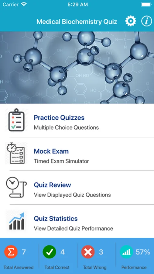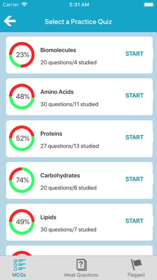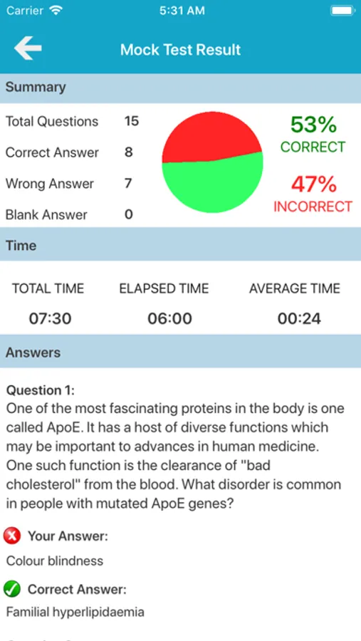 Other quiz mode is Mock Test that questions randomized each time of all topics of the medical biochemistry.