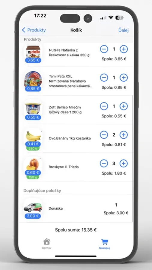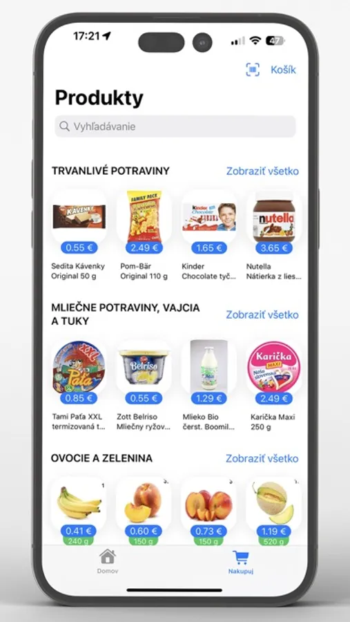 nakupovať priamo v aplikácii s možnosťou donášky k dverám či vyzdvihnutia nákupu vo vybranej predajni