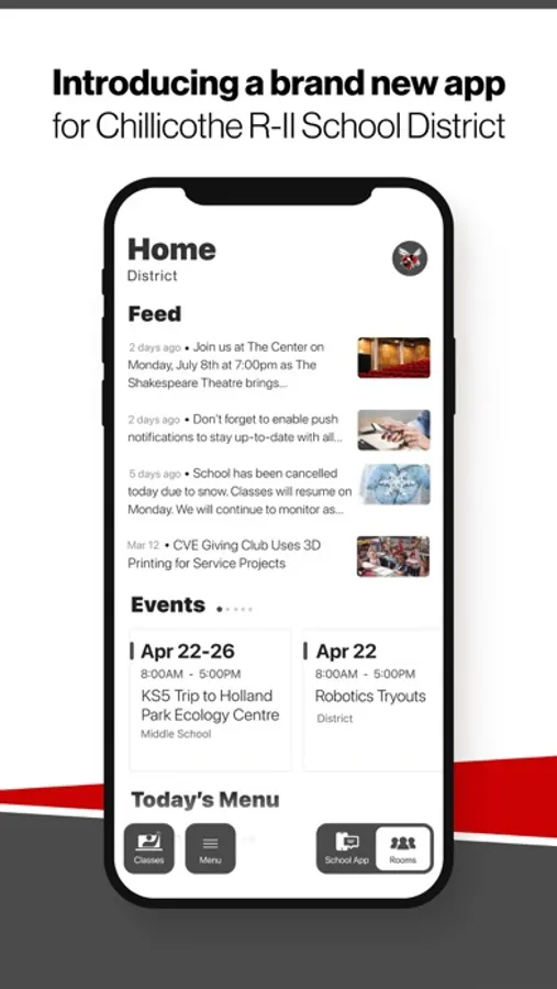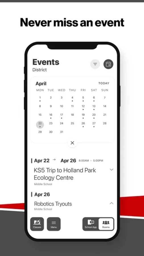 The event section shows a list of events throughout the district. Users can add an event to their calendar to share the event with friends and family with one tap.