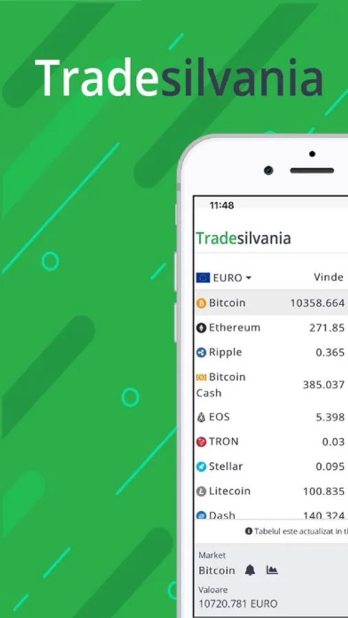Aplicatia de exchange criptomonede de la Tradesilvania iti ofera access direct la Bitcoin, Ethereum, Ripple, EOS, Litecoin, Bitcoin Cash, Stellar, TRON, Cardano, Dash, OmiseGO, Basic Attention Token, Augur, 0X, Golem, Electroneum.