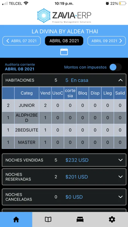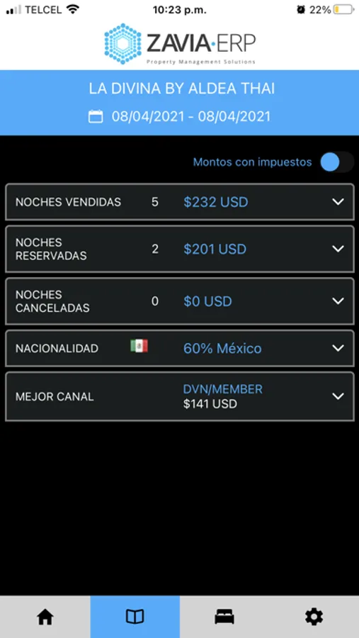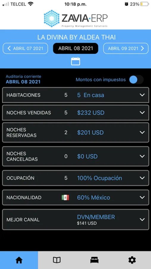 Zavia App contiene un resumen en tiempo real de la situación de tus hoteles en ventas del día, nuevas reservaciones, nacionalidades principales, ingresos por categoría de habitaciones mas vendidas, tu mejor canal de venta, etc.