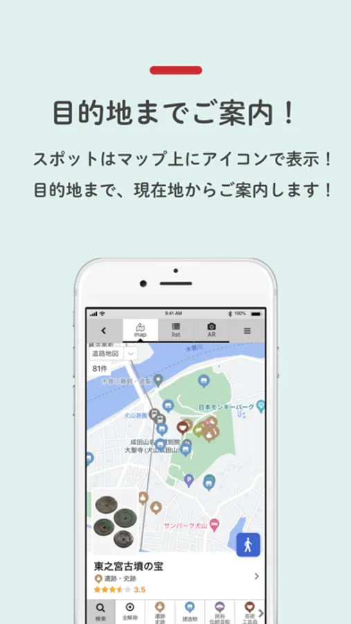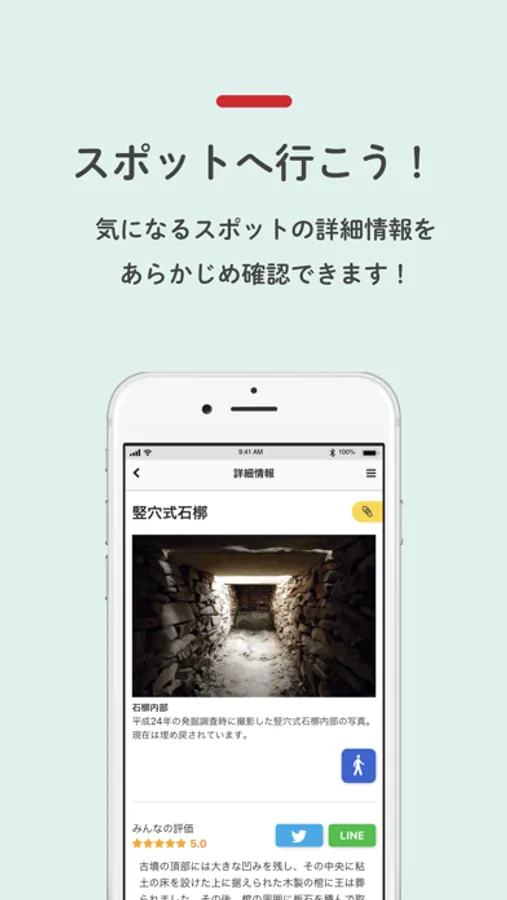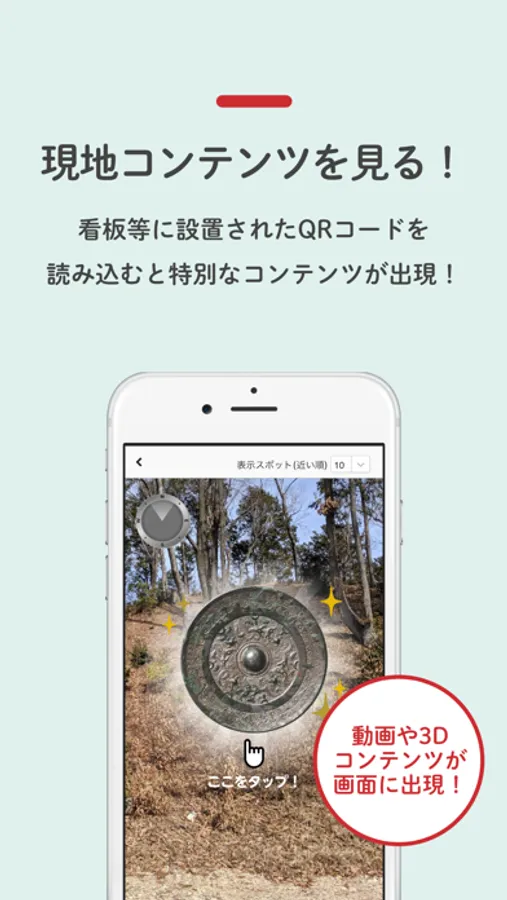 古墳を訪れた際に便利な「ナビ」機能や、現地でしか見ることができない特別なコンテンツを楽しむことができます。