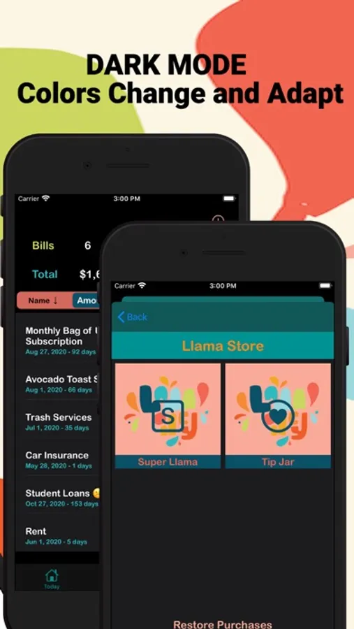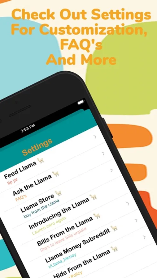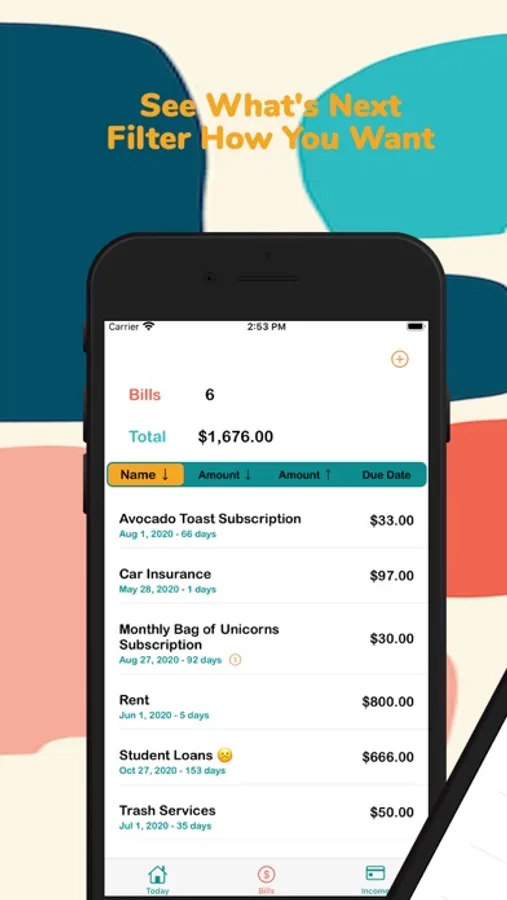 There is no need to go through and update the due dates for everything every month. If your bill comes around monthly, just tell the Llama it is a monthly bill, and the due date will be automatically updated after you have paid it. On the Today tab you can easily see at a glance how much in bills you have before payday. You can get started for free and If you want to remove all restrictions, there is no subscription. Just a one time in-app purchase and it is yours forever.