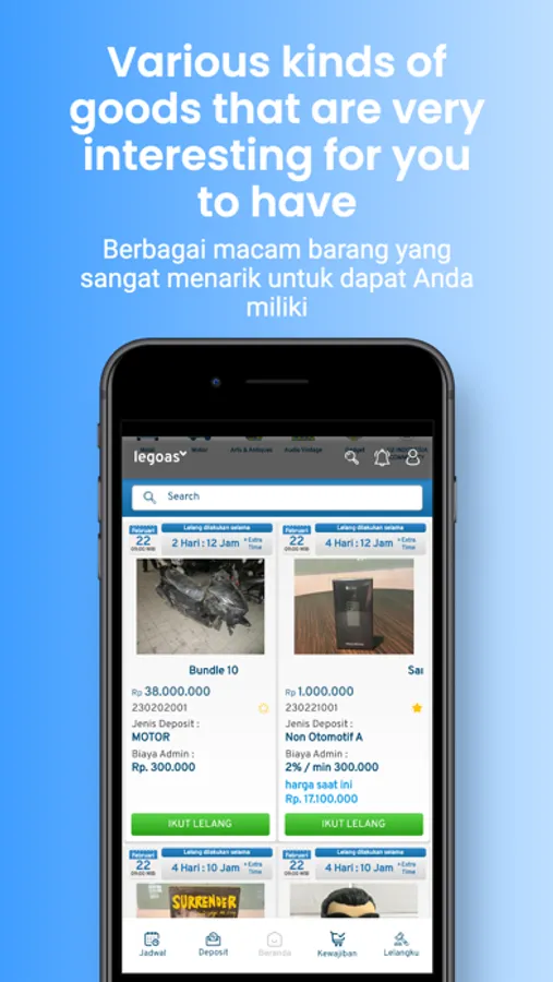Melalui aplikasi LEGOAS, Anda hanya perlu melihat dan mengikuti lelang dimanapun Anda berada! Mendapatkan kebahagiaan itu mudah!