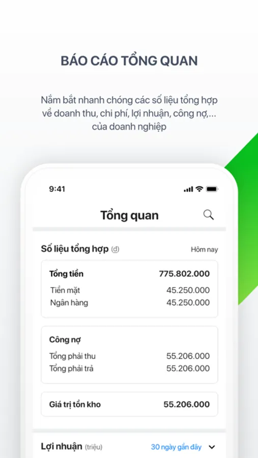 - Xem nhanh tình hình tổng quan doanh nghiệp: báo cáo lãi lỗ, dòng tiền và danh sách các mặt hàng bán chạy