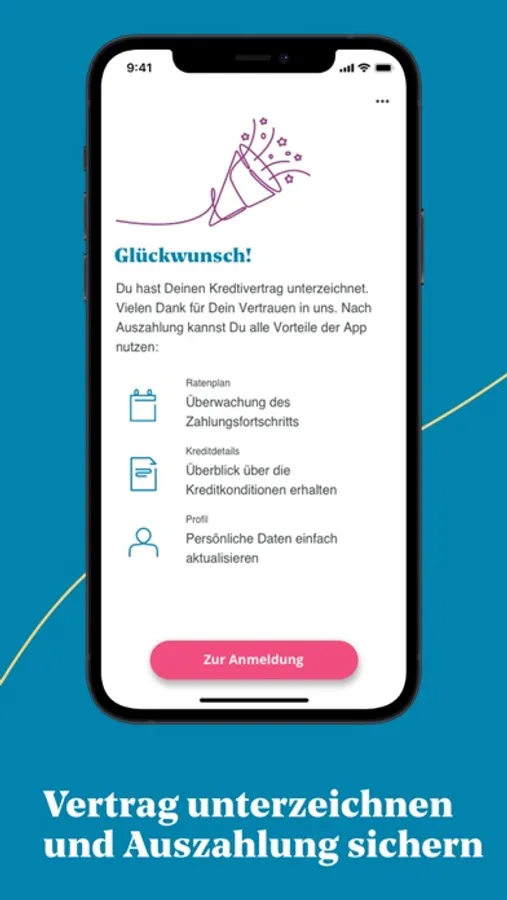 Zusätzlich kannst Du Dich in der App im Kundenbereich anmelden. Dort hast Du einen Überblick über Deine Kreditdetails und kannst den kompletten Kreditvertrag einsehen. Außerdem findest Du dort nach Auszahlung eines Kredits eine Übersicht Deines Ratenplans mit allen Fälligkeitsterminen. Deine persönlichen Daten kannst Du jederzeit aktualisieren.