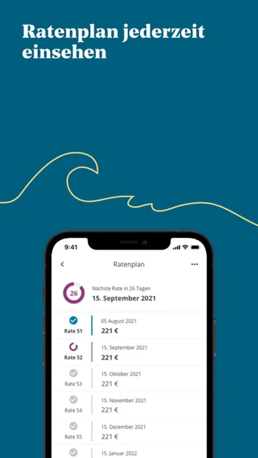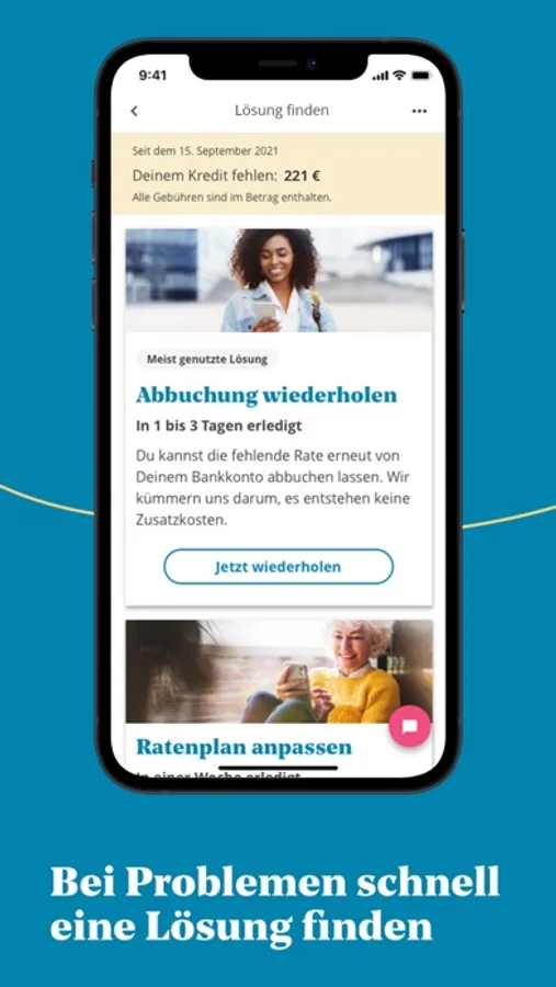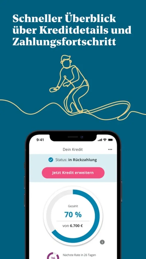 Die App ermöglicht Dir eine schnelle Übersicht über Deinen laufenden Kredit. Wer seinen Kredit aufstocken oder einen Folgekredit beantragen möchte, kommt über die App bequem zur Antragsstellung. Außerdem kannst Du Zahlungsfortschritte und Fälligkeitstermine Deiner Raten jederzeit einsehen. Zahlungsschwierigkeiten kannst Du bequem ausgleichen, indem Du in der App eine Stundung oder Ratenreduzierung beantragst.