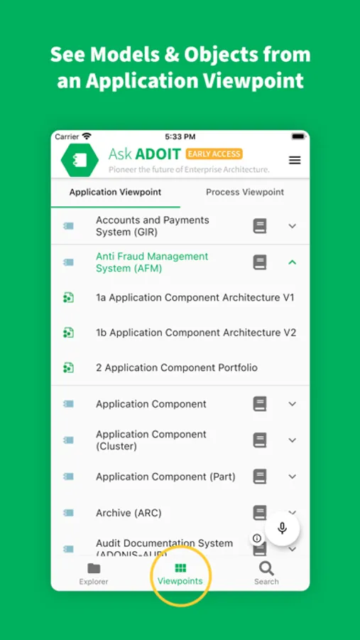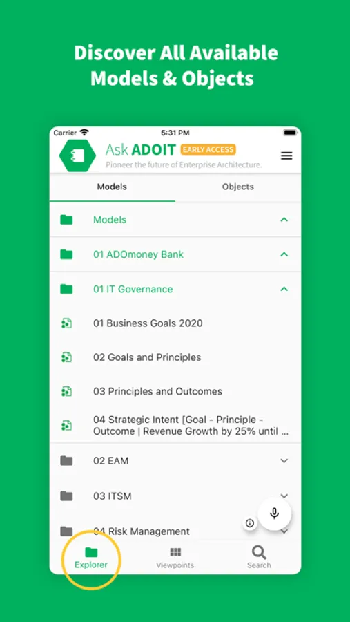 "Ask ADOIT" – the mobile app for the EA suite ADOIT – gives you anytime-anywhere access to your EA environment. You can use it either through your ADOIT Enterprise (on-premise / SaaS) or Community Edition account. From there, you’ll have the chance to access your EA content, explore new application scenarios and bring in your ideas, all by giving the developers direct feedback in our survey.