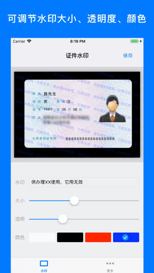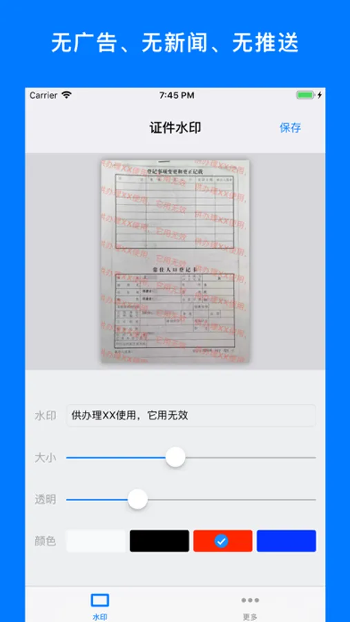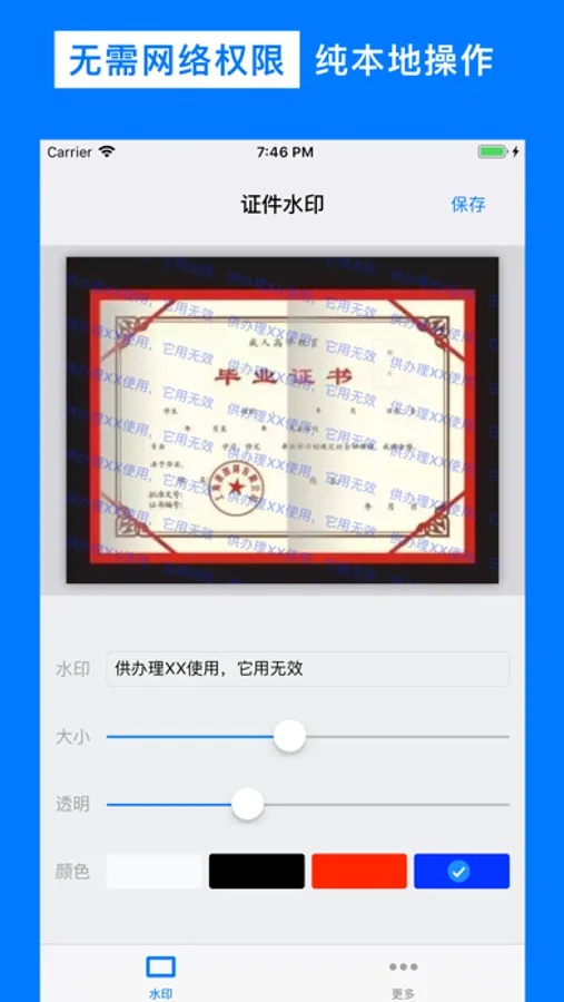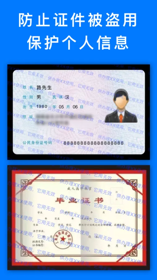 《证件水印》为证件加上水印,专门保护您的证件安全,防止您的证件被他人盗用产生不必要的麻烦和损失。【此 APP 不会使用任何网络权限,不联网,纯本地操作】