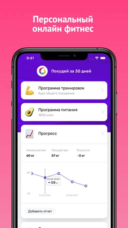 - Полный контроль за прогрессом клиента – стартовая анкета, отчеты, управление программой тренировок и программой питания, сроком доступа