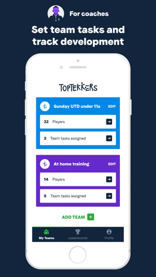 Coaches can set Individual Learning Plans as well as Team Learning Plans, monitor the progress of their players, and identify areas for improvement. Different difficulty levels can be set for different players, ensuring a personal experience for each child using TopTekkers.