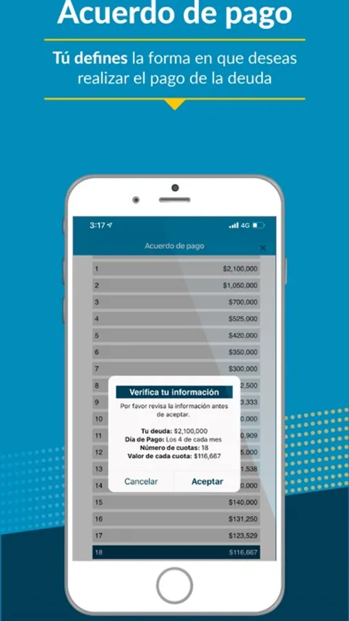Consulta tus deudas, elige el número de cuotas en que deseas pagarlas y el día del mes en que puedas realizar el pago.