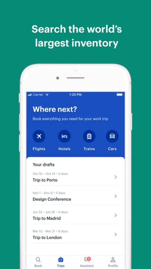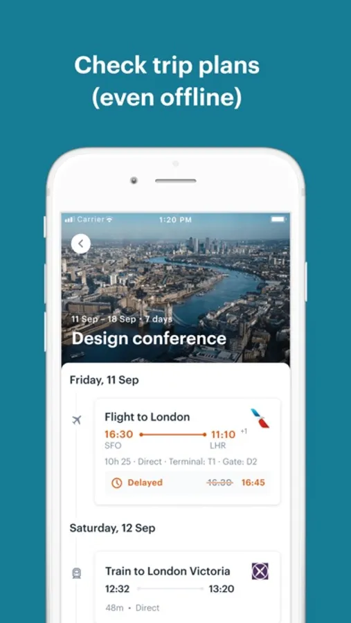 What’s more, it’s your business travel itinerary in your pocket. Get instant access to booking confirmations for your flights, hotels, trains, and rental cars. Never print passes or tickets again, and store every detail of your trip in one place.