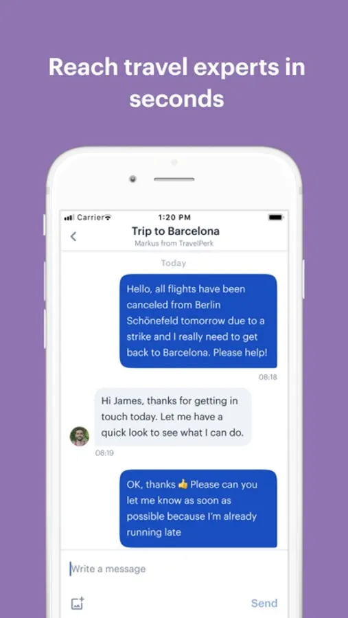 Traveling for work just got better! The TravelPerk Trip Assistant is here to make sure that all your travel plans go smoothly. It’s your direct line to real travel agents (never chatbots), no matter where you are in the world, and no matter the time of day or night. Connect with our experts in just a couple of taps to get quick answers to all your questions and queries.
