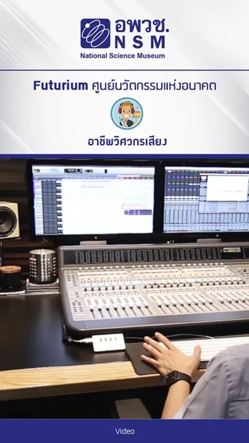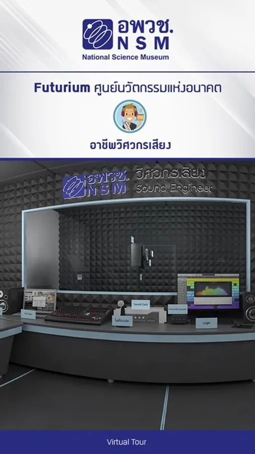 ศูนย์นวัตกรรมแห่งอนาคต ชมพิพิธภัณฑ์วิทยาศาสตร์เสมือนจริง ในรูปแบบ 360 องศา คุณจะพบกับ อาชีพวิศวกรเสียง (Sound Engineer) การออกแบบ วิเคราะห์ ควบคุม จัดการทางด้านเสียง เพื่อสร้างสรรค์นวัตกรรมและเพิ่มศักยภาพของผลผลิตในอุตสาหกรรมต่างๆที่เกี่ยวข้อง ต้องใช้ทักษะ ความสนใจ ความชื่นชอบทางด้านเสียงหรือเพลง ใผ่รู้ หมั่นฝน ความอดทน ทักษะการสื่อสารที่ดี ทำงานร่วมกับผู้อื่นได้ นอกจากนี้คุณจะมีความเพลิดเพลิน จาก วีดีทัศน์ คอนเทนต์เนื้อหาต่างๆ เสมือนมาเยี่ยมชมพิพิธภัณฑ์จริงๆ เพียงแค่ปลายนิ้วสัมผัส