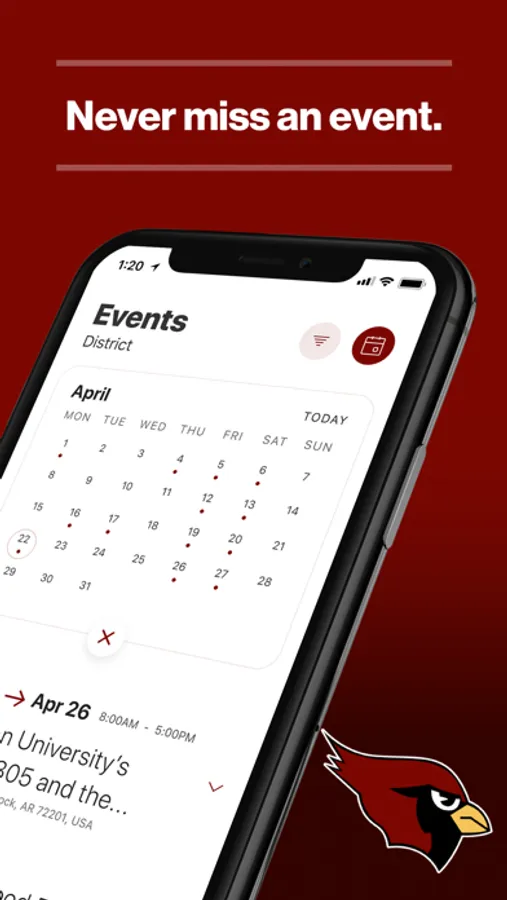 The event section shows a list of events throughout the district. Users can add an event to your calendar to share the event with friends and family with one tap.