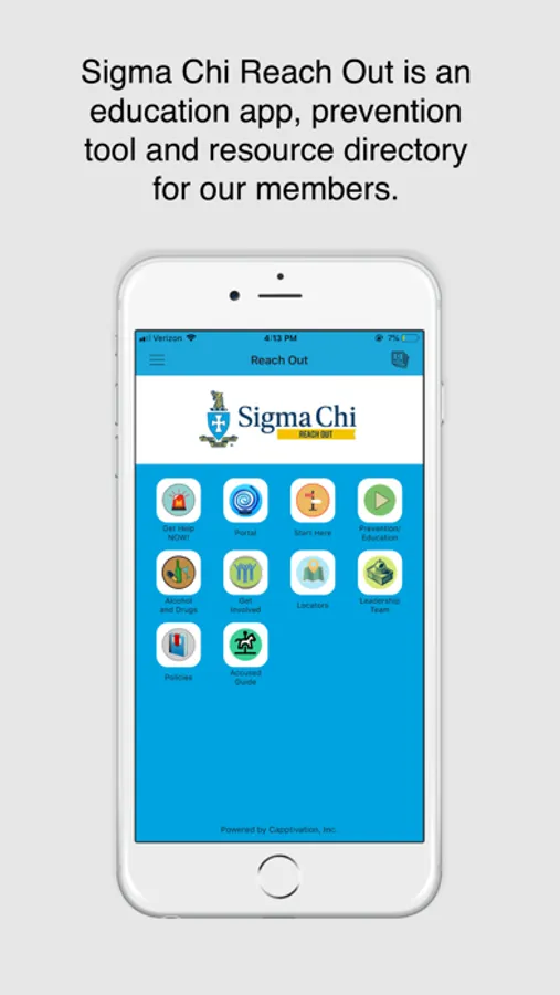 The Sigma Chi Reach Out app is the first place to go if you or a friend need immediate help, information for on-campus resources or local off-campus resources, hotlines or if you have a question about mental health, sexual