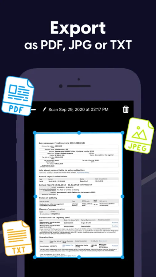 Use our text recognition feature to convert any scan into text and then edit it to your liking. The advanced text scanner supports multiple languages such as English, German, French, Spanish, Italian,Japanese, Chinese, Portuguese, Russian, Korean, Dutch, Swedish, Norwegian, Turkish, Ukrainian, Arabic, Hindi, Hebrew and even converts different languages in the same document. The app is also a fast QR scanner.