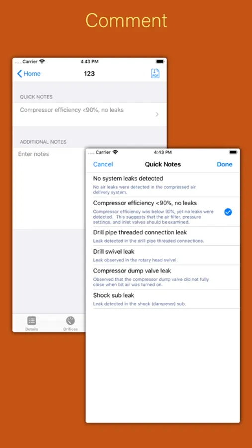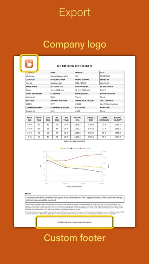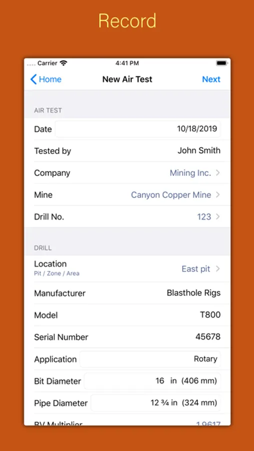 This app accompanies air flow test kits that measure the air pressure (volume) of mining drill bits.