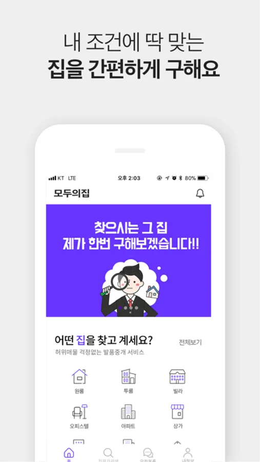 '모두의집'에서는 내가 원하는 조건에 딱 맞는 매물을 부동산 전문가들이 직접 발품 팔아 구해드리는 착한 서비스를 제공하고 있습니다.