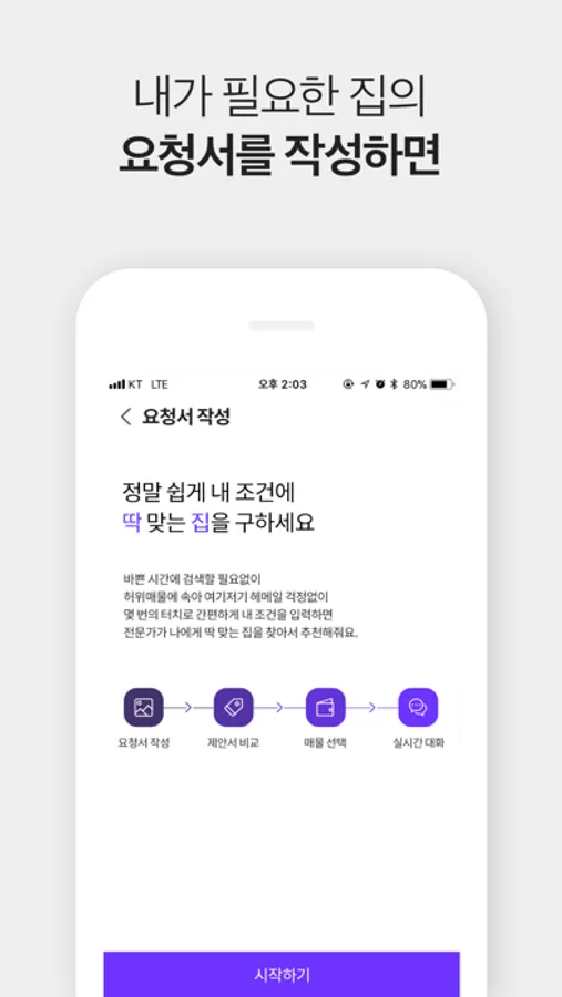 - 매물의 종류, 지역, 예산, 등 원하는 집의 조건을 간편하게 작성하여 전문가에게 좋은 매물을 구해달라고 요청합니다.