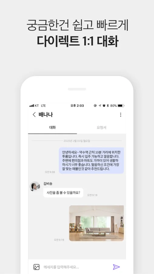 - 전문가가 직접 발품팔아 실시간 톡으로 소개하는 매물들의 금액, 위치, 면적, 옵션 등 상세 내용을 확인하세요.