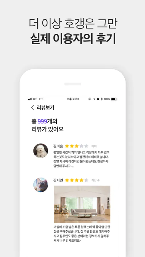 - 전문가가 제안한 매물이 마음에 들었다면 광고 리뷰에서 볼 수 없는 고객님만의 생생한 경험이 담긴 실제 후기를 남겨주세요.
