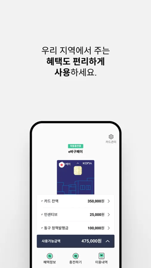 지역경제 활성화를 위해 충전 시 인센티브를 제공하고, 동구 주민에게 복지 수당을 지급하는 수단으로도 활용됩니다.