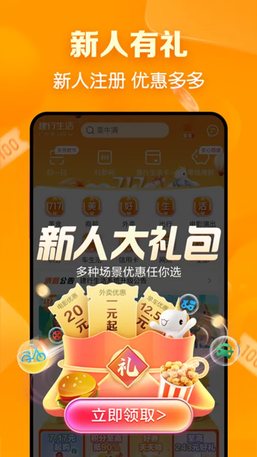 建行生活app是中国建设银行官方出品的本地生活服务平台,汇聚优质餐饮、品质外卖、打车出行、充值缴费等生活场景,无论您是否为建行卡持卡人,只要手机号即可完成注册登录,享受吃喝玩乐一站式服务。