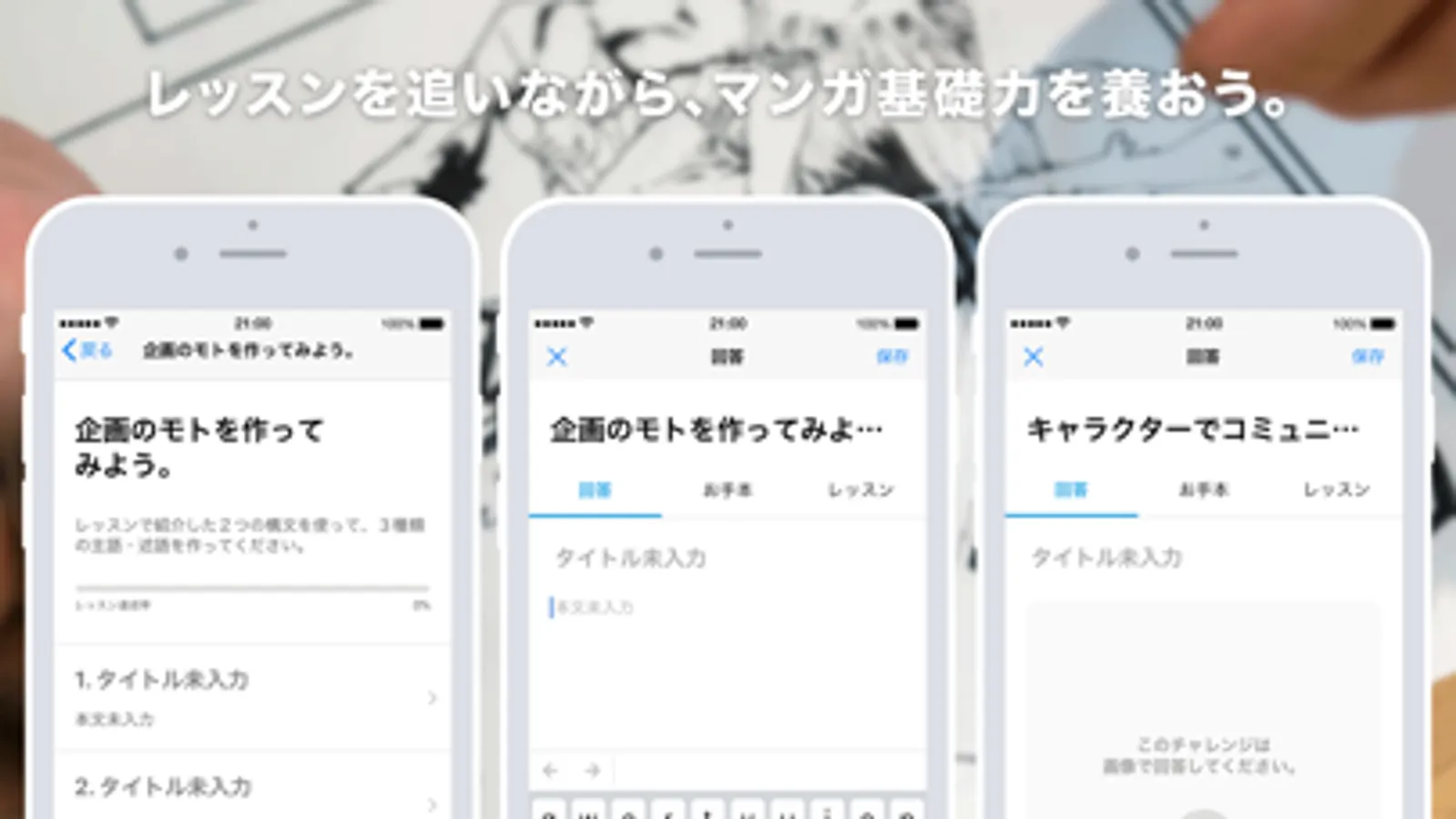 レッスンは、多数の連載獲得作家・新人賞受賞者を輩出する実践派マンガ教室「いるかM.B.A.」にて実際に使用されているトレーニングメニューを基に、アプリ用に再構成したものです。実績のあるコンテンツが20本収録されています。