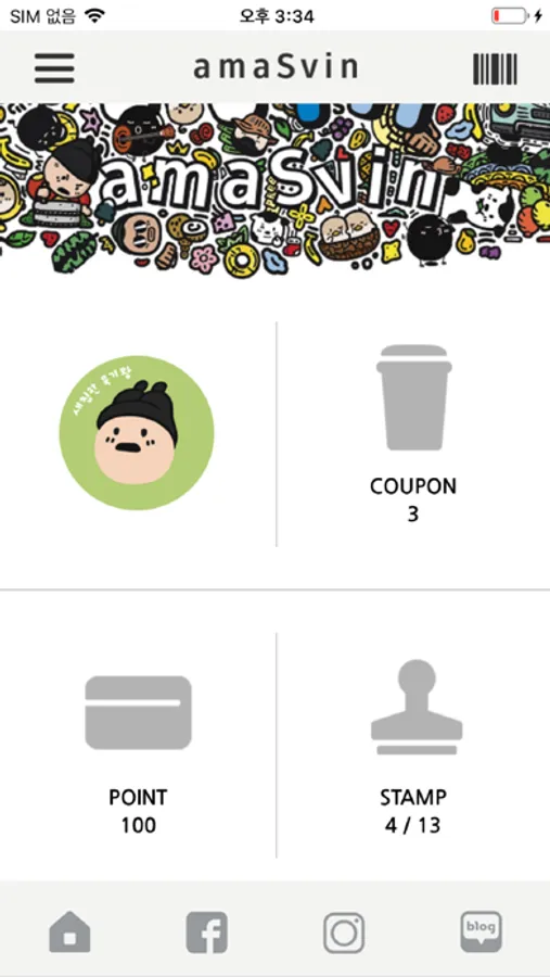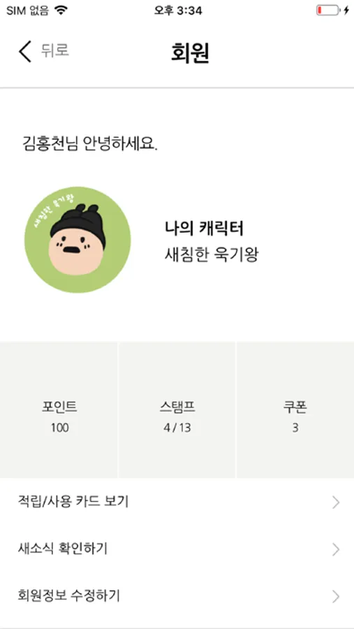 1) 메인 화면/회원: 현재 보유한 포인트와 스탬프, 쿠폰 현황을 한 눈에 확인할 수 있습니다.