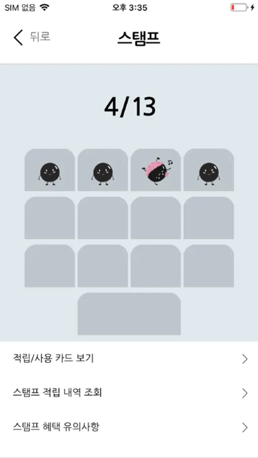 4) 스탬프: 매장에서 결제를 할 때마다 1개씩 적립되며, 13개 적립 시 무료음료권 쿠폰을 발급합니다.