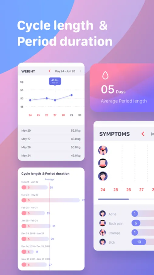 - Analyze your cycle and period duration, weight changes and activity during the cycle