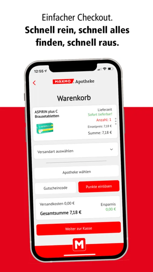 Er ist 24 Stunden für Sie geöffnet und liefert innerhalb von 2 Stunden* während der MAXMO Apotheken Öffnungszeiten. Ab 25 € Bestellwert selbstverständlich kostenlos, sonst mit einer Liefergebühr von 3,95 €.