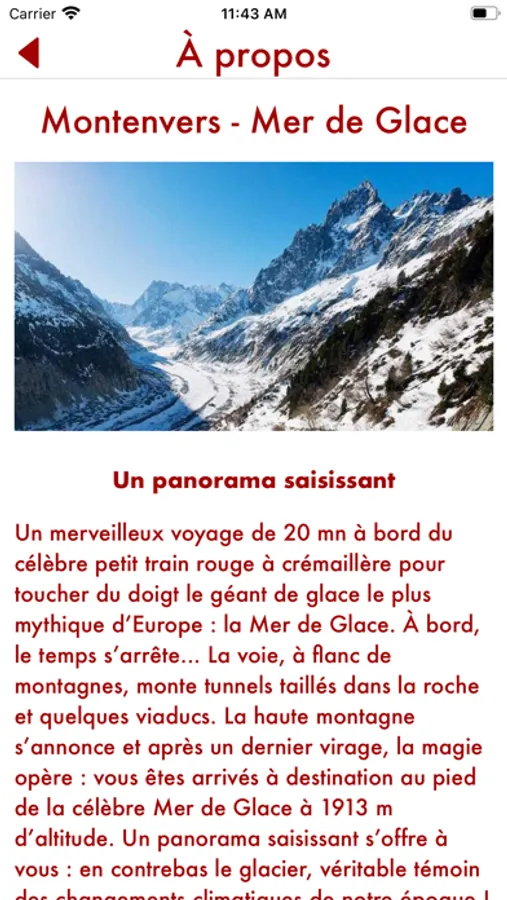 Cette application guide audio grand public est destinée à informer, accompagner les visiteurs empruntant le petit train du Montenvers dans leur voyage vers la mer de glace au départ de Chamonix.