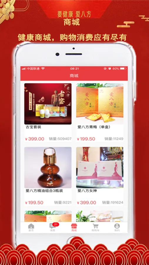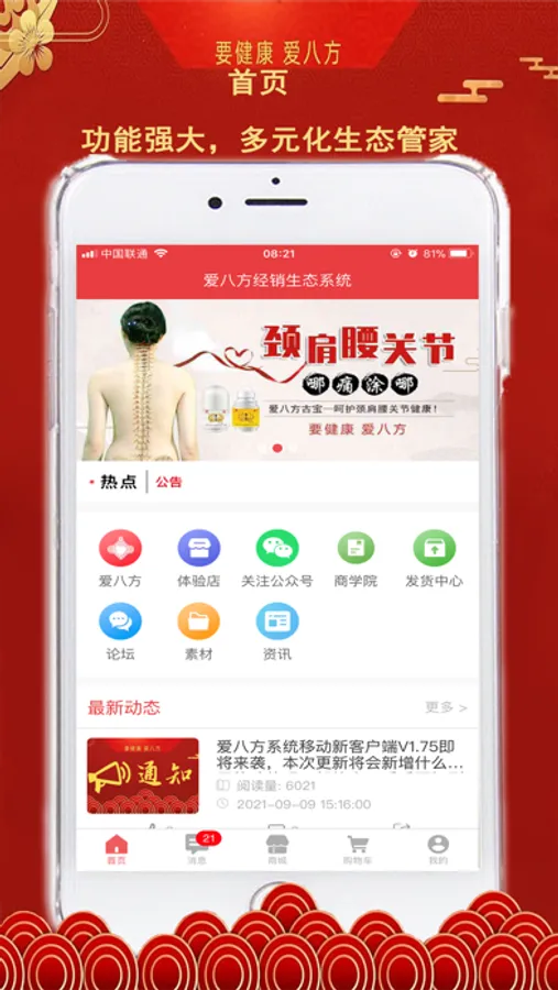 爱八方商城是一款实体结合互联网的订阅平台,可对爱八方业务范围内的商品进行订阅、购买。爱八方业务范围包括中医文化传承、中医药研发、生产、与销售流通、骨科连锁、护身宝生命健康数据化平台。