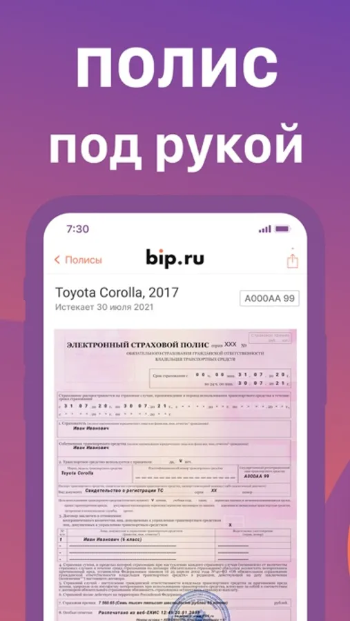 Страховка придет на e-mail сразу после покупки, а также будет всегда доступна в приложении. По закону электронный полис не обязательно распечатывать, достаточно показать его на экране смартфона сотруднику ГИБДД для проверки. Электронный полис становится мобильным!