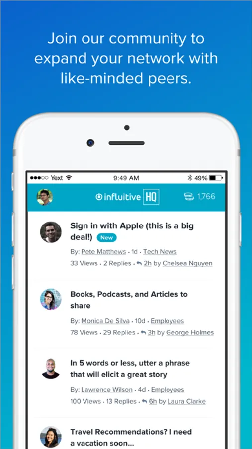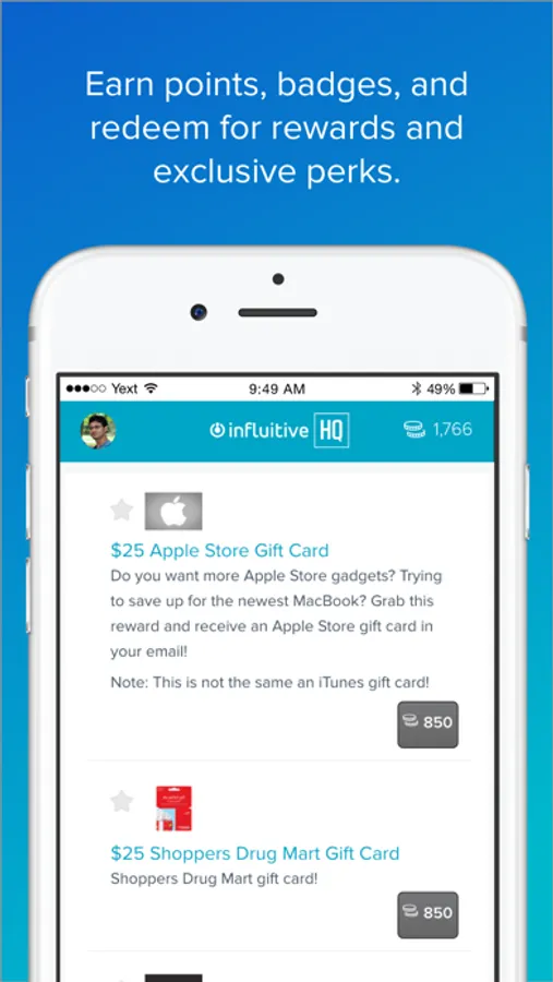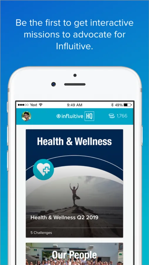 Influitive HQ is an interactive platform for employees and friends of Influitive. It allows for easy and quick access to share information with your network, answer surveys, share stories, and provide referrals.