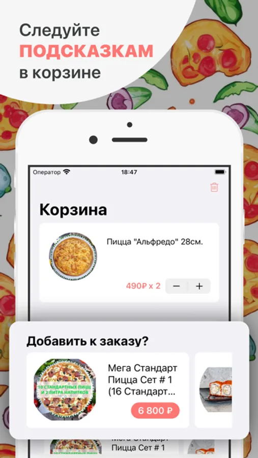 Как сделать заказ в приложении “Химки Пицца”: выберите понравившиеся позиции из меню, добавьте их в корзину и перейдите на экран оформления заказа (по нажатию на иконку корзины).
