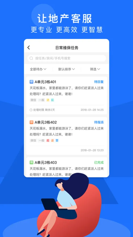 “明源智慧客服”是一款地产客服部门专用的日常办公软件,覆盖了日常管理、交付服务、风险管控等业务所需的相关功能,可以帮助地产企业规范常规服务、提升房屋交付质量和客户满意度、把控各类内部和客诉风险,是实现客服部门价值显性输出的绝佳利器。
