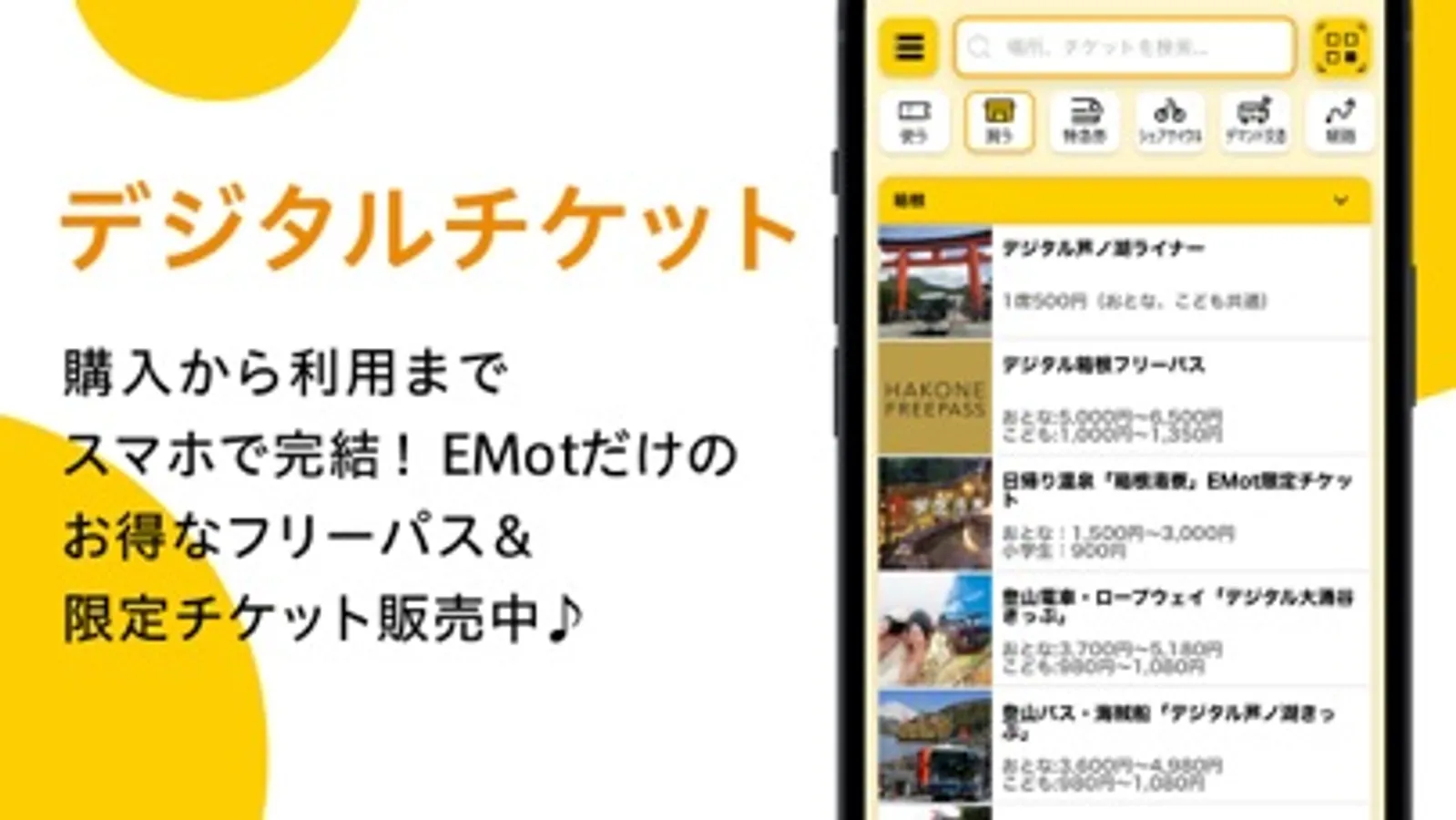 EMotでは観光や日常生活に便利な電子チケット (デジタルチケット) を販売しています。購入したら、あとはお店や駅でEMotの画面を見せるだけ!