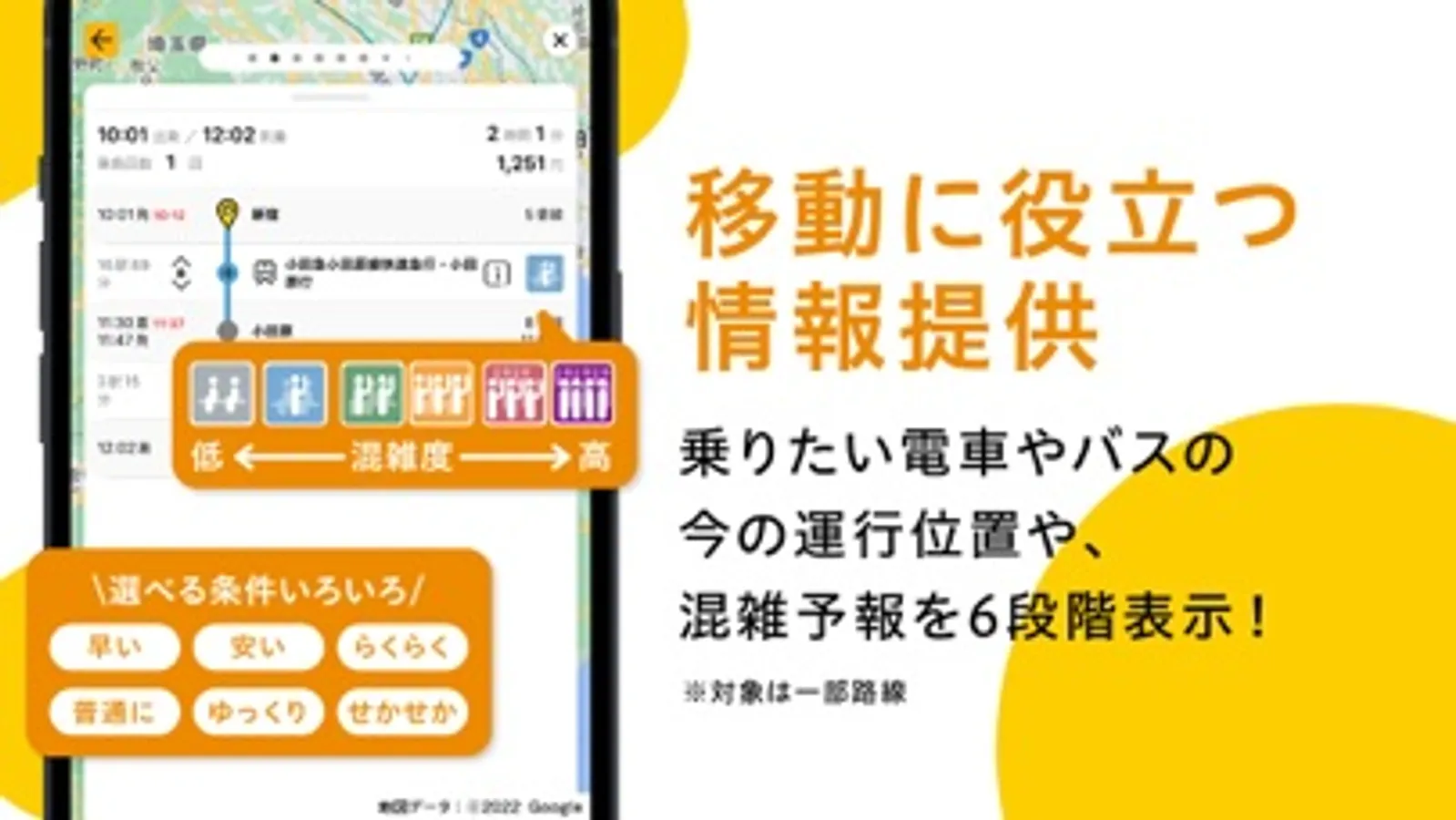 地図上で「今いる場所」や「行きたい場所までのルート」、「お出かけ先でのお得なチケット・エリア情報」を知ることができます。